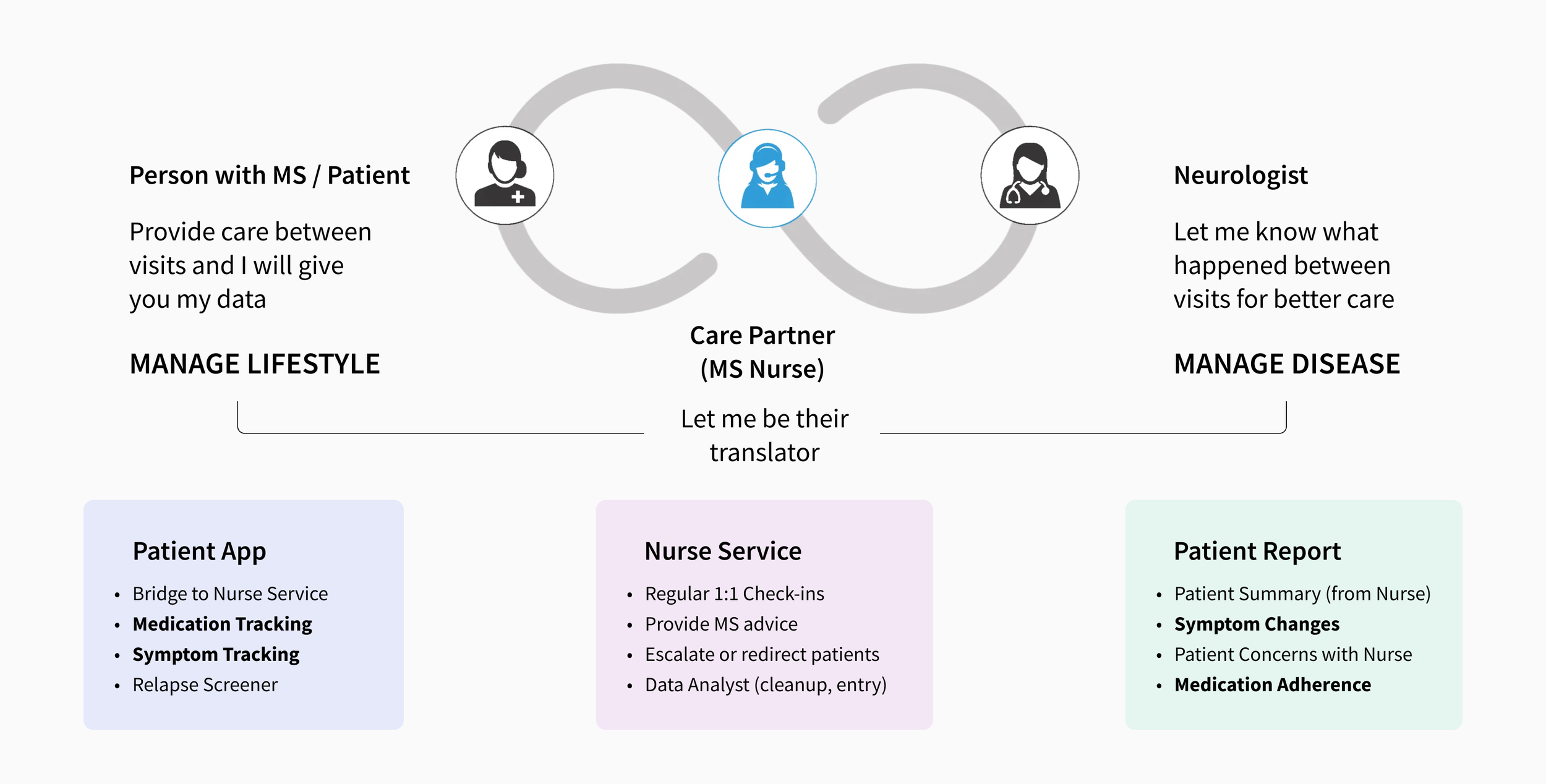This case study highlights one aspect of the broader system I designed. Beyond the tracking, I designed the MS Nurse service model, defining how nurses provide value, how the app enables communication and coordination for monthly check-ins, and what happens during those sessions.