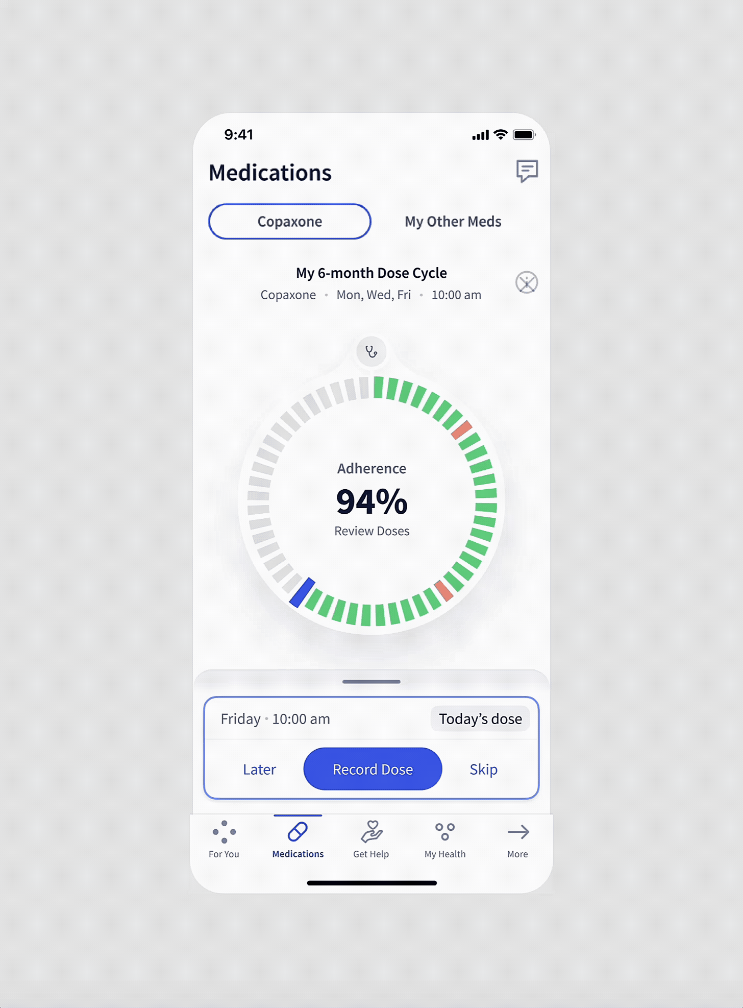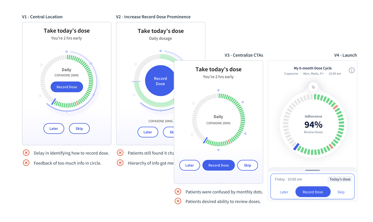 Insights from user testing that I conducted helped fine-tune interactions, refine layout logic, turning the Dose Cycle, a place for patients to review and track progress till their next visit into a clear and intuitive tool.