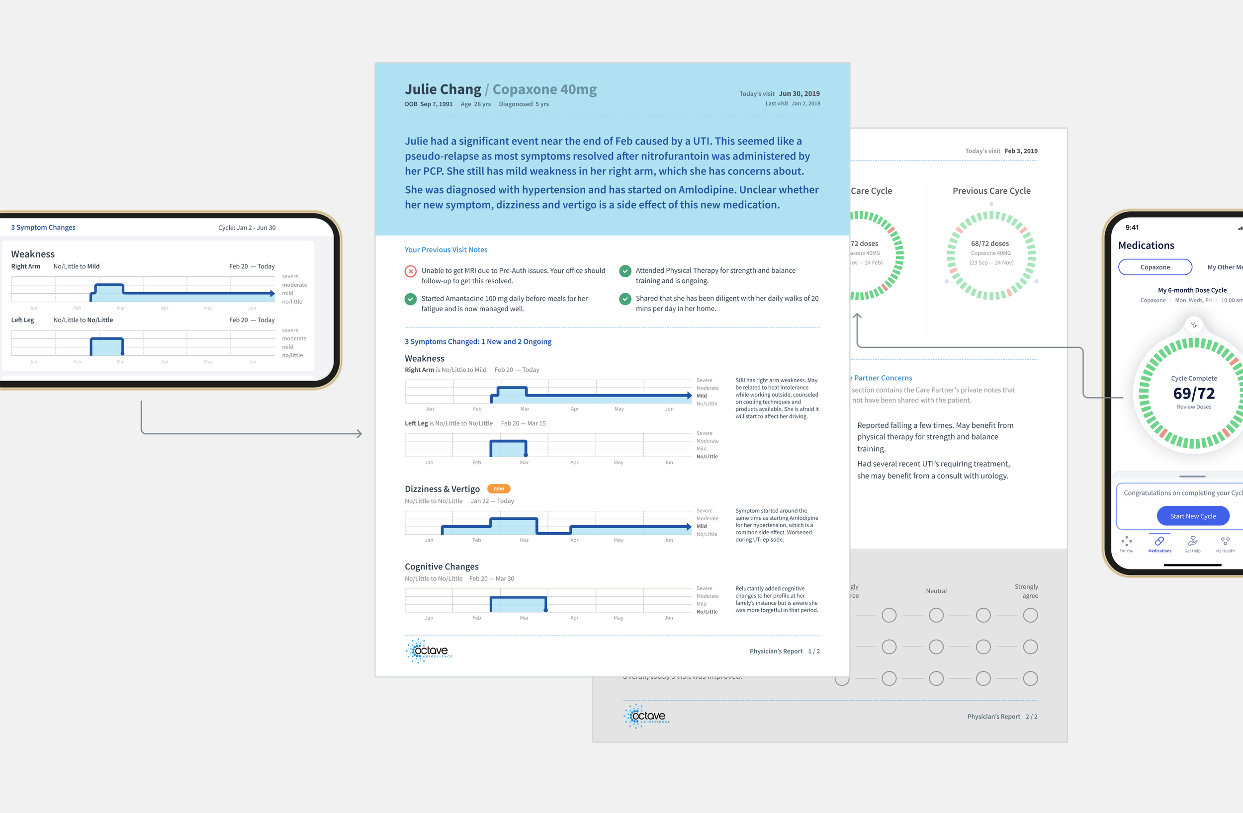 The data components from the patient app were used almost as-is into the patient report for the neurologist. This was useful not only for the patient who could directly connect their efforts to the report but made it easier for development to build. Other components in the report are filled in by the Octave Nurse.