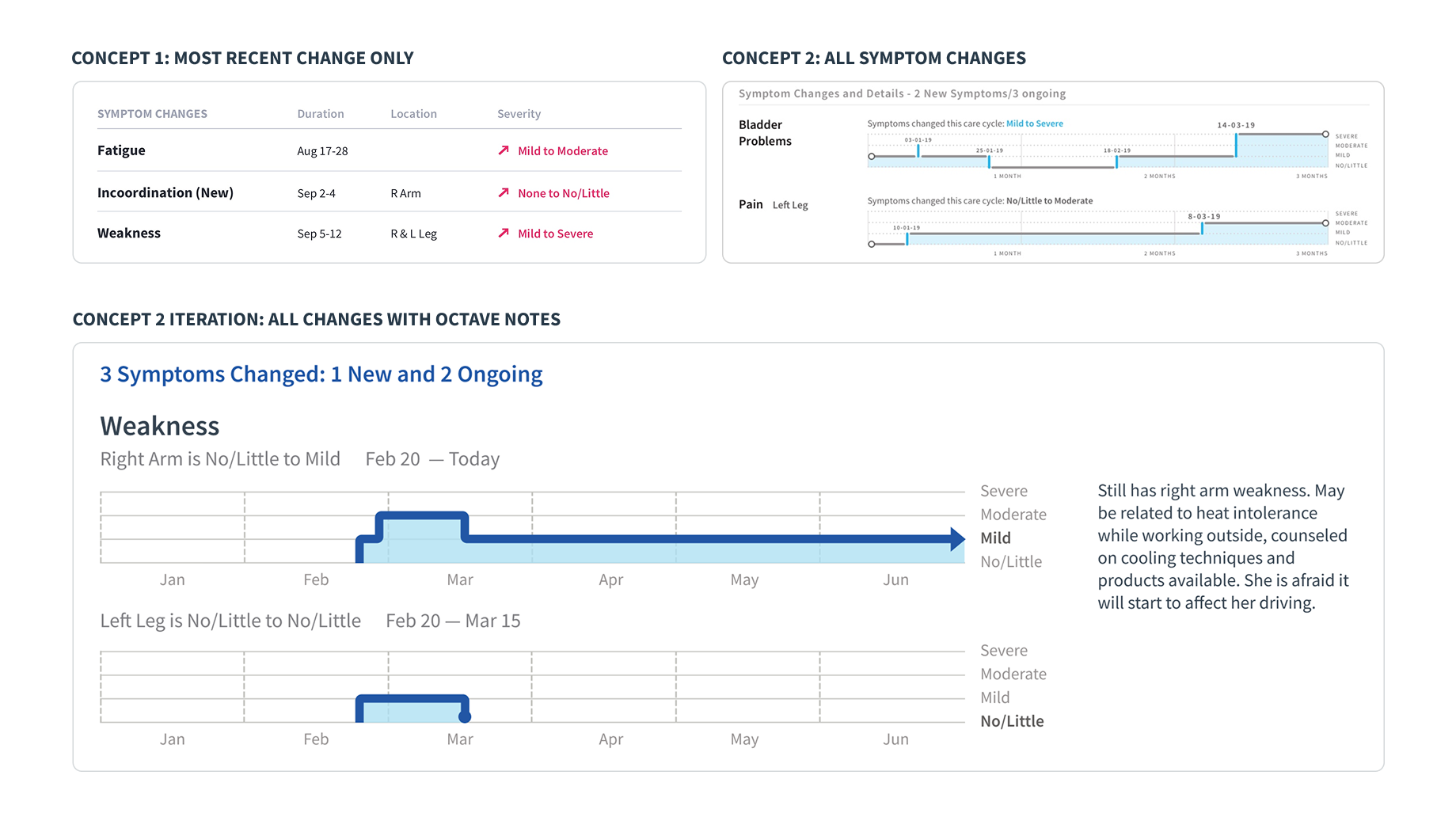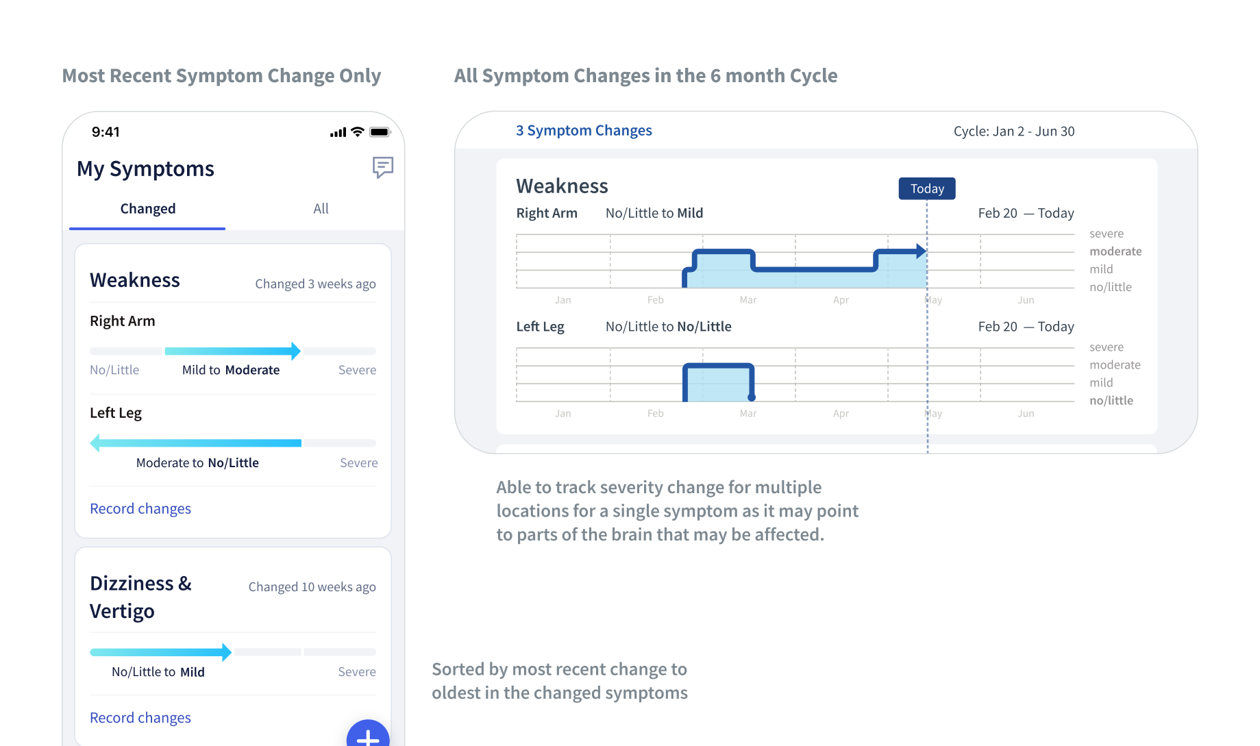 This shows how patients can see the symptom changes they have recorded between their visits while also being able to review all of their past symptoms that we would get from their EHR and during their onboarding process.