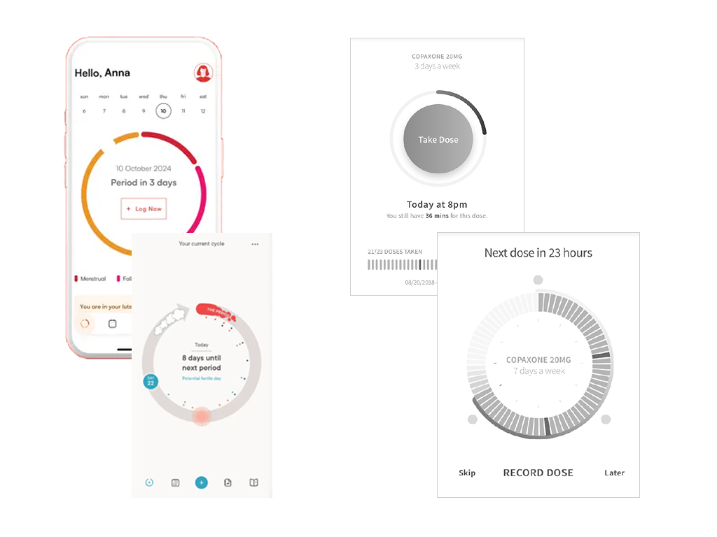 Recognizing similarities with lifelong fertility cycles, I drew inspiration from fertility apps with the concept of a circle to review and track their doses.
