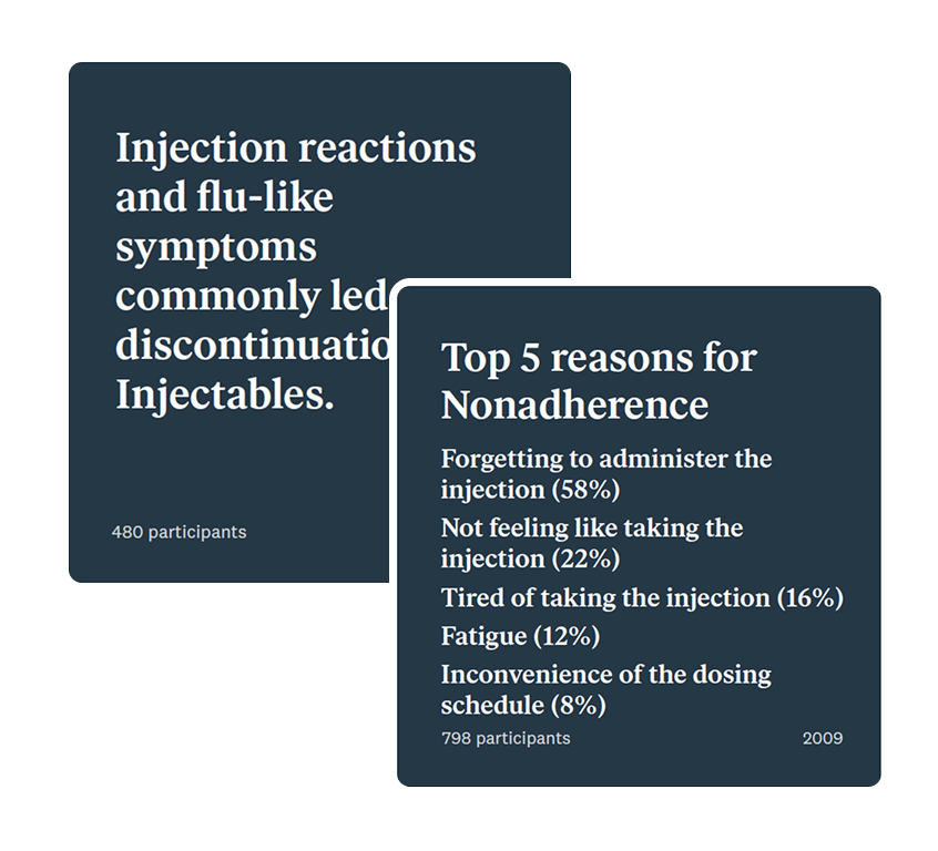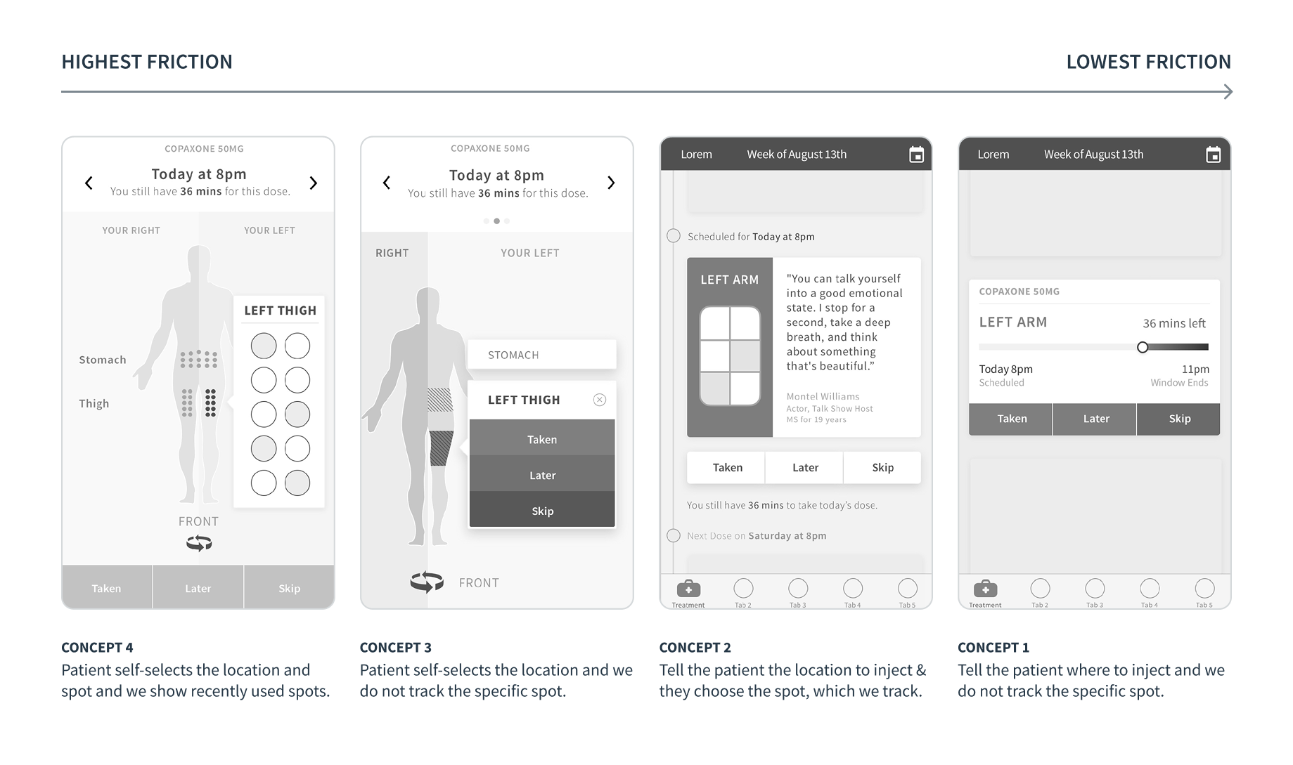 Working at an early-stage startup with limited MS expertise, I researched medical journals and learned that injection site rotation was critical to prevent reactions—the primary reason patients discontinued their medication.